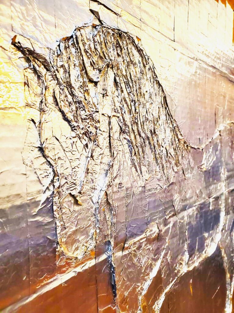 That moment sparked a vision. I set aside its original purpose and laid the tape over a plain piece of recycled cardboard. Layer by layer, I began sculpting — not just a physical form, but an emotion. I wasn’t building something utilitarian; I was constructing a mood, a memory of light in darkness, a silent explosion of shimmer and depth. Thus, “Luminous Silence” was born — a piece that explores the tension between stillness and brilliance.